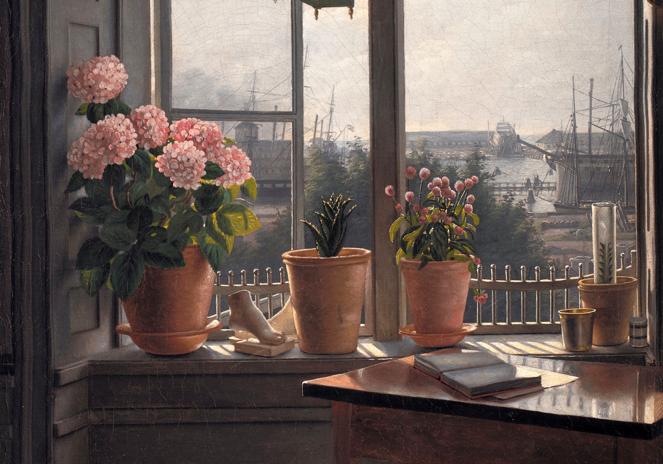 Un alfeizar con plantas. Una ventana abierta al mundo, en este caso, a un puerto. Es la Vista desde la habitación del artista, una pintura que Martinus Rørbye creó en 1825 y que hoy me sirve para abrir en el blog una ventana a la esperanza.