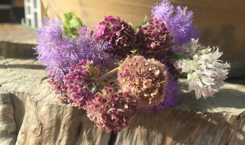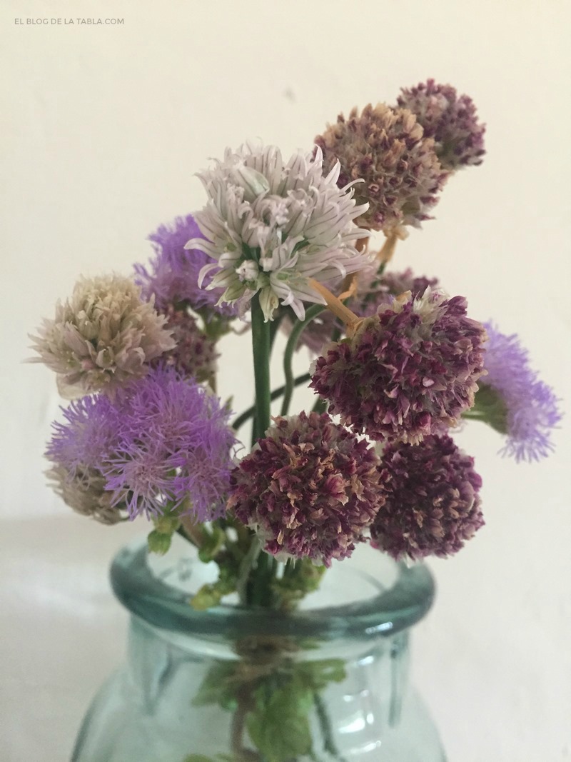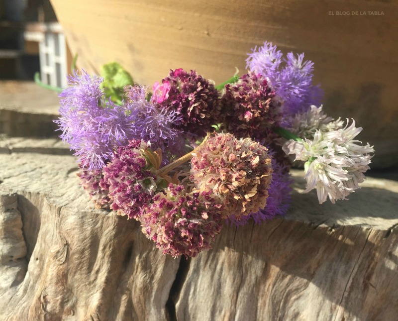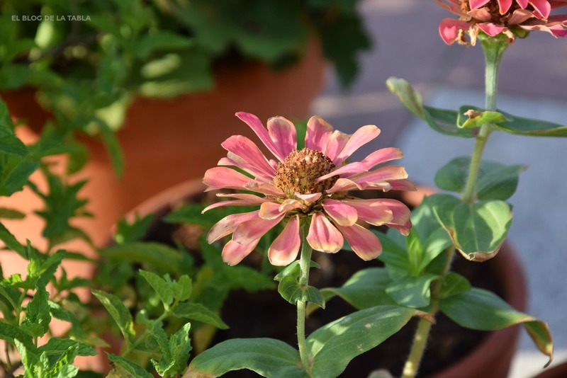 Hay flores frescas, pero también flores que van decayendo, y que en ocasiones lo hacen con elegancia, tanto como para merecerse un final con todos los honores, como ese ramillete con cabezas de flores de cebollino (Allium schoenoprhasum), Armeria marítima y Ageratum que improvisé hace unos días cuando pinzaba y limpiaba algunas plantas. Todo vale, especialmente si sus colores armonizan. La Zinnia es otra de las plantas cuyas flores saben envejecer con estilo. Además, en algunas especies, como Rudbeckia o Zinnia, cuyas flores, no solo evejecen bien, sino que es aconsejable mantenerlas envejecidas el mayor tiempo posible, porque su néctar sigue atrayendo polinizadores.