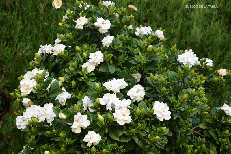Tras un mes de junio floreciendo sin parar y perfumando el calor como si no hubiera un mañana, aún se puede apreciar alguna que otra flor de Gardenia jasminoides. Y, como no, los jazmines, las estrellas del verano, están en su momento y ayudarán a crear mágicas y muy fragantes noches estivales. Con aroma especialmente delicado, el Jasminum sambac ‘Gran Duque de la Toscana’ o el Jasminum sambac ‘Belle of India» florecen estos días sin que parezca afectarles demasiado la ola de calor que ahora se va apaciguando.