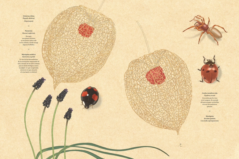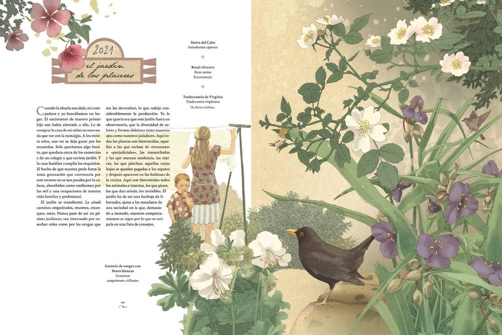 ¿Qué consiguió en con esas visitas diarias a su jardín? Un libro de una belleza impresionante, con 206 páginas de gran formato, profusamente ilustrado con minuciosos dibujos, acompañados de textos muy bien documentados sobre la flora y fauna que protagonizan cada una de esas historias.