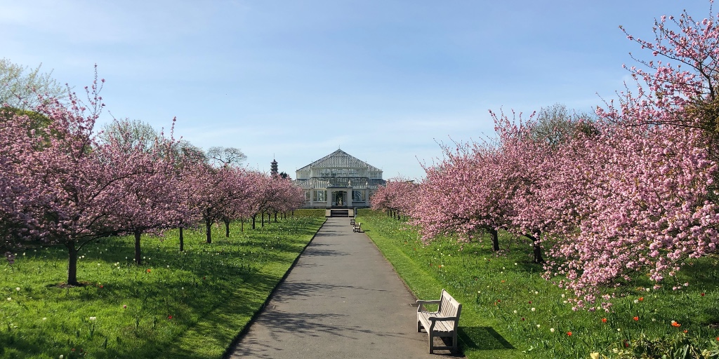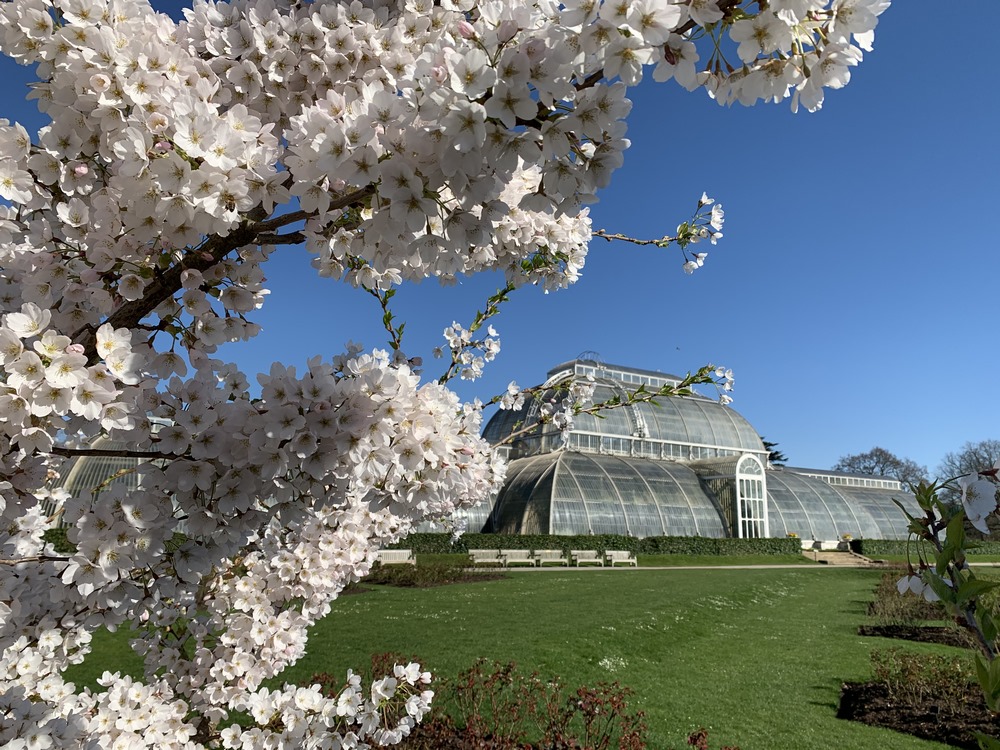 Desde ese paraíso hortícola, estos días no solo nos ofrecen una vista aérea de los jardines. También, el Arboretum, un vivero de última generación donde crecen sus árboles. Los cerezos que florecen a puertas cerradas. Un invernadero, Palm House, rodeado de árboles, donde conservan las palmeras. Otro, The Princess of Gales Conservatory, donde podemos pasear desde los trópicos hasta el desierto.