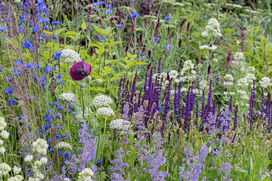 Las amapolas (Papaver somniferum ‘Lauren’s Grape’) se entremezclan con una gran cantidad de plantas vivaces que incluyen centáureas, nepetas, y las flores blancas de Allium nigrum.