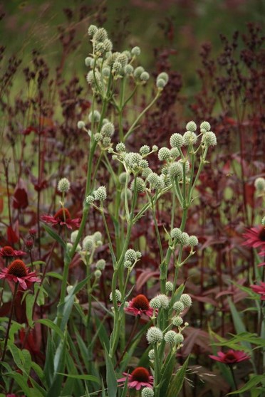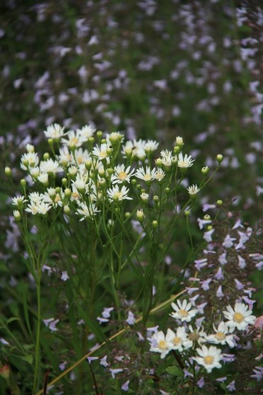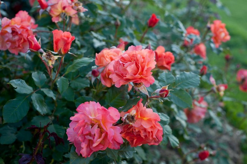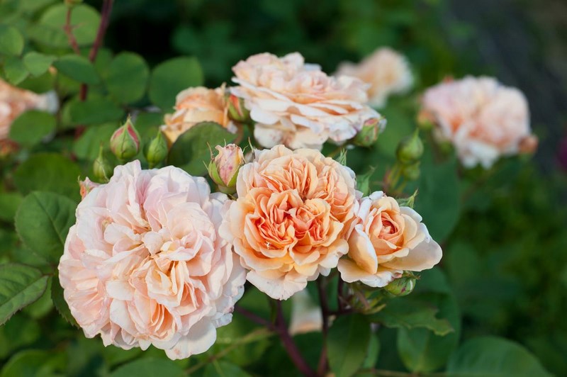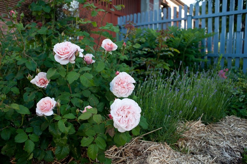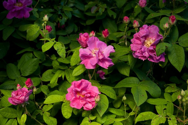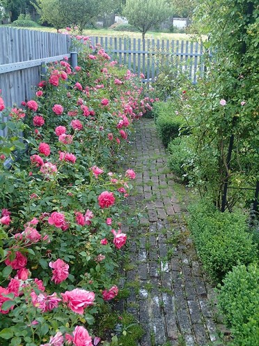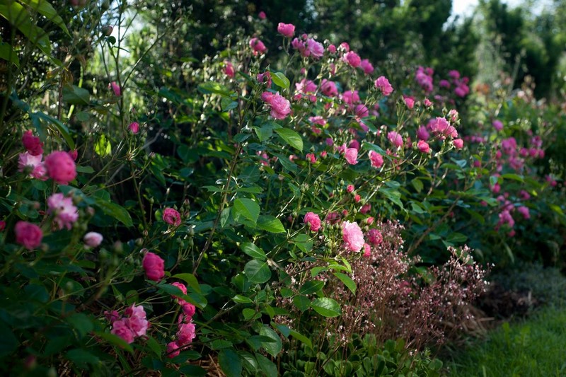 No quiere híbridos de té, no le gustan las rosas grandes en su jardín; pero dentro de los rosales modernos, sí elige rosas Poliantha y trepadoras. Además, también ha introducido especies de rosas silvestres. Muchas de las variedades se plantan mezcladas, formando pequeños grupos, que ofrecen mejor aspecto que la agrupación de varios arbustos de un mismo tipo. Cuando las rosas se combinan con vivaces, procura que sea de forma suave, puesto que, durante el periodo de floración de las rosas, éstas serán siempre dominantes. Por ello, elige vivaces de flores muy pequeñas y en tonos blanco, azul y púrpura; que incluyen variedades de Alchemilla, diferentes especies Geraniumy de Salvia.
