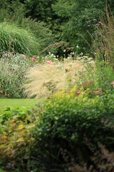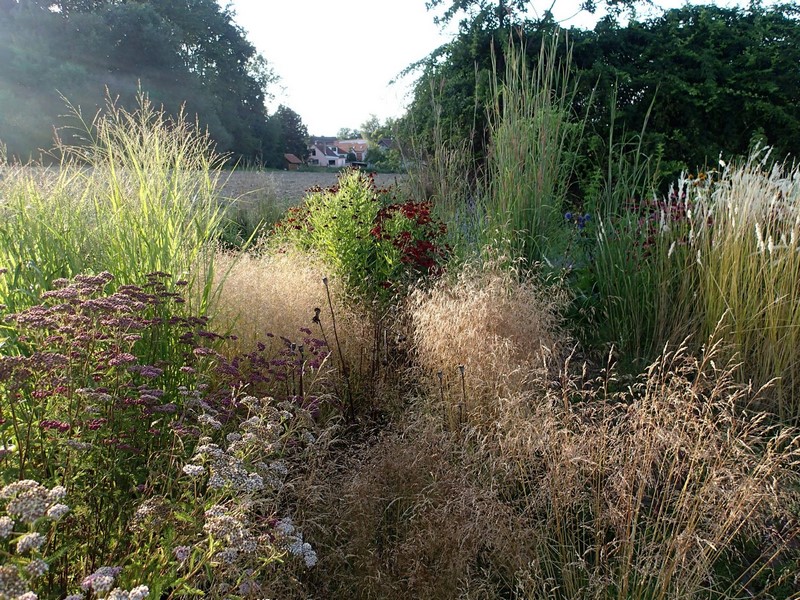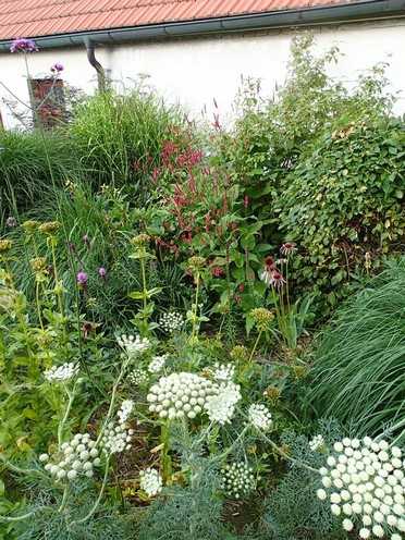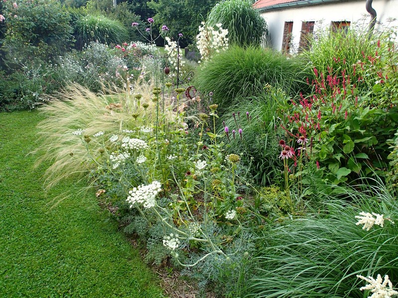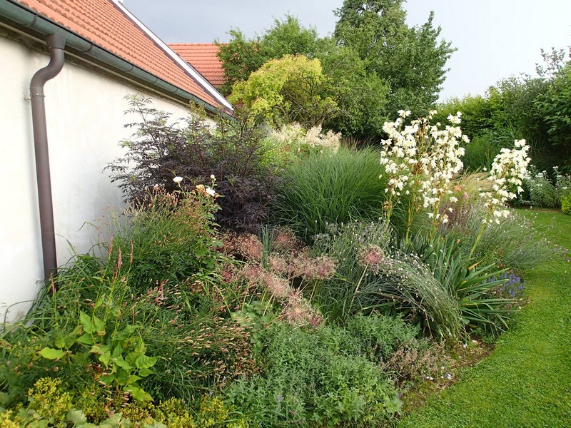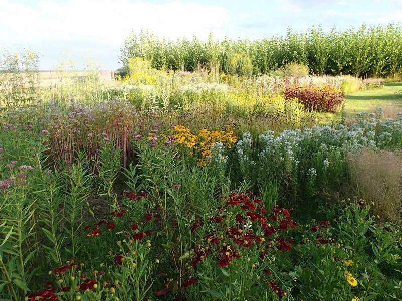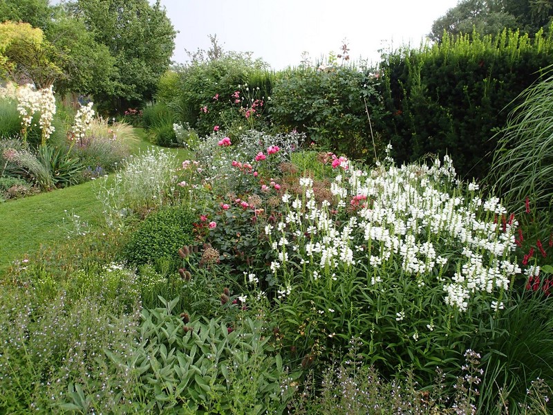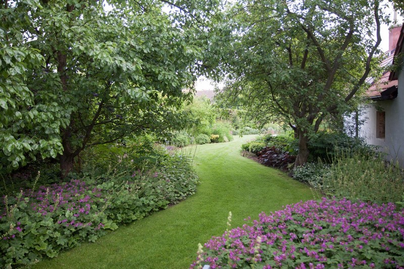 El jardín combina espacios con forma libre junto a setos recortados. En la superficie libre y bajo los árboles frutales se suelen plantar gran cantidad de plantas vivaces, bulbos, gramíneas, rosas y arbustos en flor.
