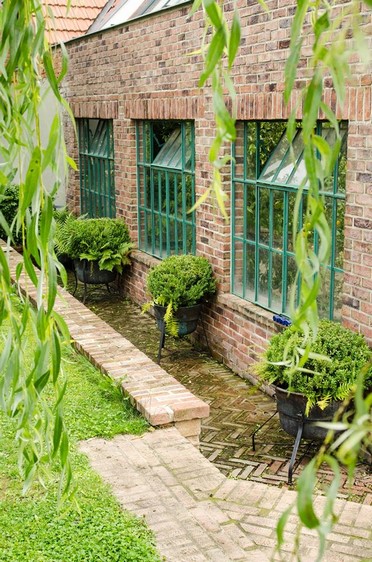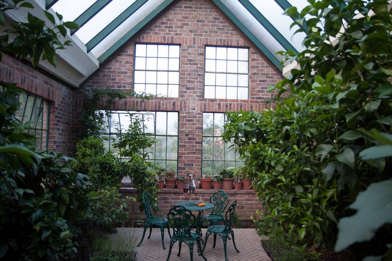 Un amplio patio pavimentado y cerrado embellece el estanque natural con una cubierta de madera y una zona de estar cubierta con fuego abierto. Un patio para disfrutar. También crearon un precioso invernadero en un patio de ladrillo situado bajo un nogal. En él se protegen y cultivan plantas subtropicales. Existe también una zona con granero en el que se instaló un huerto con camas elevadas, así como un refugio para las aves de corral.